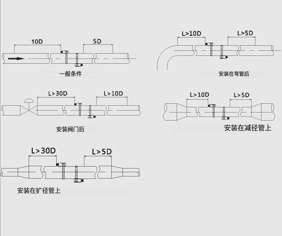 为保证流量计的测量精度,流量计附近安装的直管段长度尽量满足以下要求:上游>20D,下游>10D。